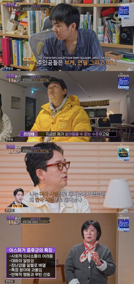 김정태 부부는 “한국어보다 영어를 더 편하게 생각한다”라며 우려를 표했다. 김정태는 “지금은 제가 알아 들을 수 업는 수준이다. 영어식 한국 표현들이 많다. 아들이 ‘본인은 미국 사람으로 태어나야 하는데 왜 한국 사람을 태어나야 하냐’고 하더라”라며 국어 과외까지 받았다고 털어놨다.