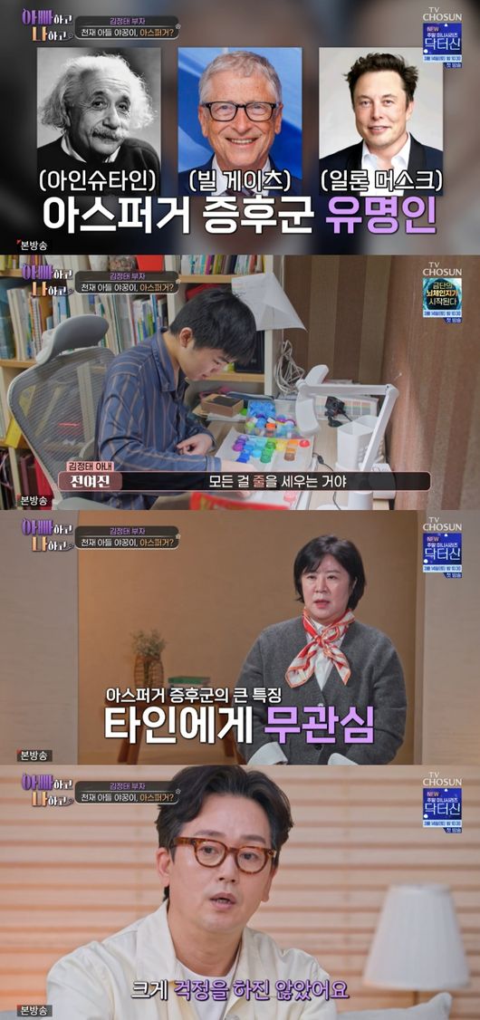 특히 김정태 아내는 “지후가 아스퍼거 증후군이 있다고 생각하고 있다”라고 의심했다. 아스퍼거 증후군은 사회적인 의사소통이 어렵고, 대화의 일방성, 장난감은 일렬로 배열하고, 특정 분야에 과몰입, 반복적인 행동과 루틴 신호 등의 증상이 있다. 그리고 이는 아인슈타인, 빌 게이츠, 일론 머스크도 아스퍼거 증후군을 겪었다고.