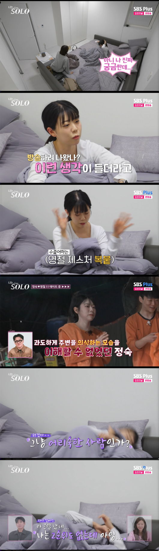 정숙은 데이트 상대였던 영철에 대해 영숙에게 속마음을 털어놓으며 “아니 나 진짜 궁금한데, 방송하러 나왔나? 이런 생각이 들더라. 너무 방송을 신경 쓴다”라고 직격타를 날렸다.