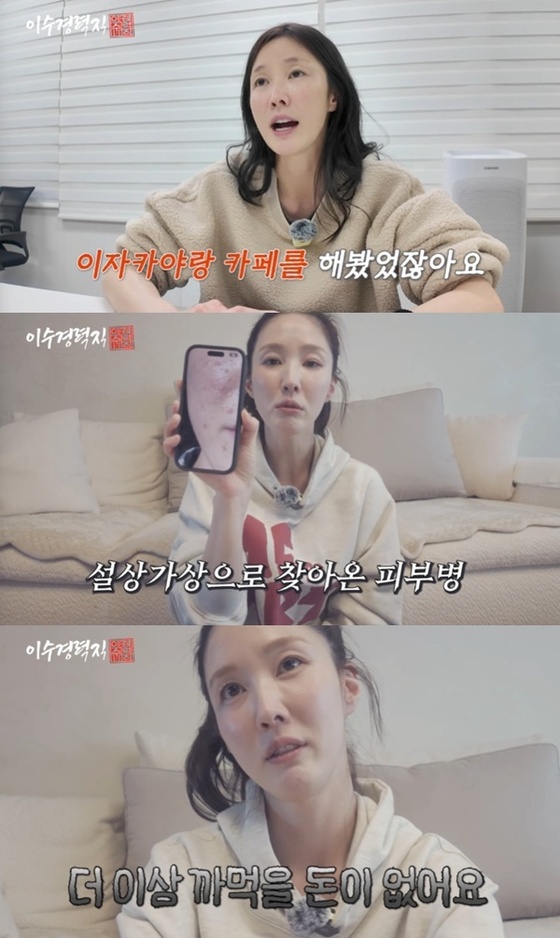 이후 마음의 병과 피부병까지 얻은 이수경은 당시 심각했던 피부 사진을 공개했다. 이수경은 "노출이 되면 안되고, 화장으로 가려지지 않았다"라며 치료가 되지 않아 일이 들어와도 할 수 없는 상황에 5년의 공백기가 생겼다고 털어놨다. 은퇴까지 고려했던 이수경은 당시 외출이 힘들어 경제활동을 할 수 없었다며 "적금, 보험 깨고, 있는 건 다 깼다"라고 덧붙였다.