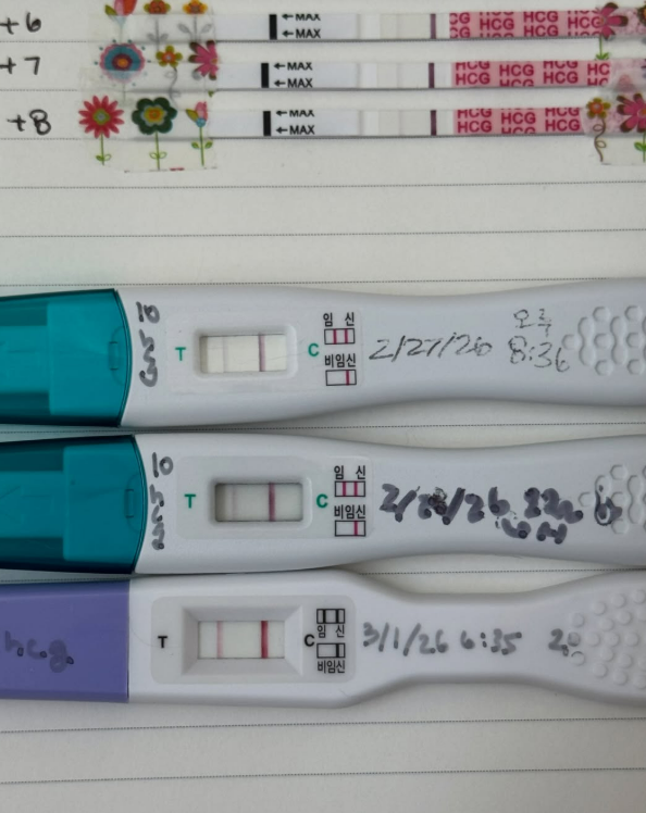 첫 이식 소식을 알린 그는 "감사하게도 7일차에 임테기에서 매직아이를 보았다. 그 이후로 선이 아주 조금씩 진해지는 걸 보면서 '내가 정말 임신이 된 건가' 싶었다. 그런데 인생은 참 그렇게 쉽게 기쁨만 주지는 않더라"고 운을 뗐다.