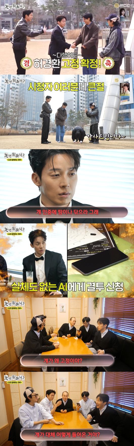 하지만 AI의 허경환 저격은 계속됐다. 멤버들은 AI가 경환이가 고정인데 왜 인정 안하는지 궁금하다며 다시 AI에게 "허경환을 왜 놀면 뭐하니 고정 멤버로 인정을 안해주는 거냐"고 물었다.