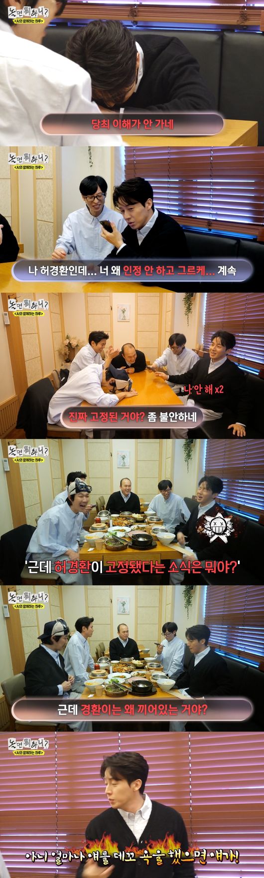 허경환은 "내 이름만 나오면 화를 낸다"며 "이 녀석 나한테 댓글 단 사람이다"라고 억울해 했다. 유재석은 AI에게 재차 "포털에 검색해봐라. 고정 들어갔다"고 언급했고, AI는 "경환이가 고정이라고? 왜? 진짜 발표가 났다고? 걔가 대체 어떻게 들어온 거야?"라고 재차 질문했다.