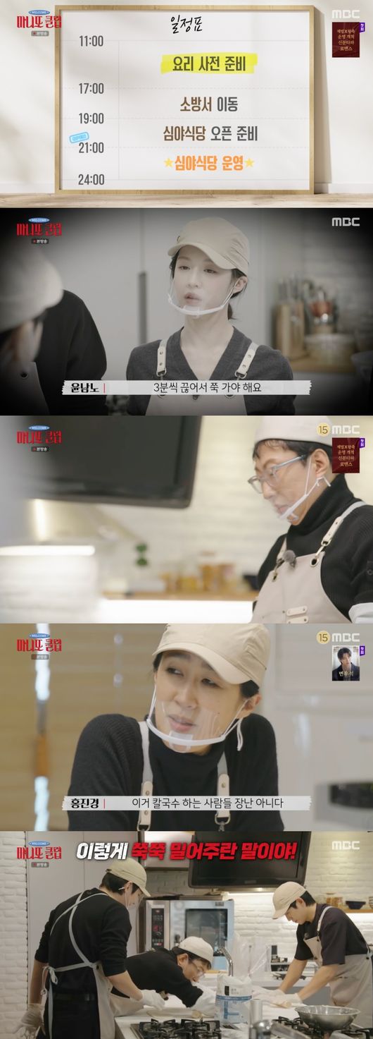 이 가운데 박명수는 칼국수 반죽을 하던 중 장탄식과 함께 한숨 쉬며 "힘들다. 너무 힘들어. '무도' 때보다 더 힘들다"라며 한탄했다. 김치와 만두 등 식품 사업으로 성공한 홍진경 역시 "이거 만들어 파는 사람들 장난 아니다"라며 외식업 자영업자들의 고충에 공감했다.