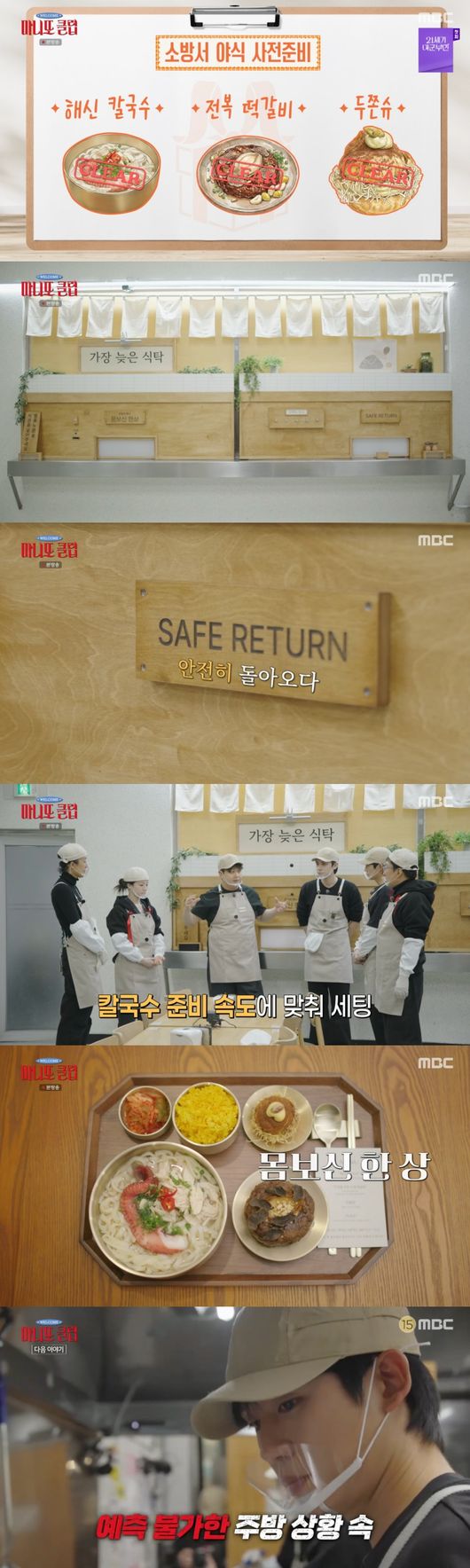 메뉴는 국물 요리는 사치처럼 여기는 소방관들을 위한 몸보신 해신칼국수, 전복떡갈비, 그리고 두쫀슈. 손칼국수에 닭을 삶아 살만 달라 결대로 찢어내고, 문어도 삶아 잘라놓는가 하면, 홍고추와 각종 야채 고명에 전복 손질과 떡갈비 반죽, 두쫀슈까지 갈 길이 멀었다.