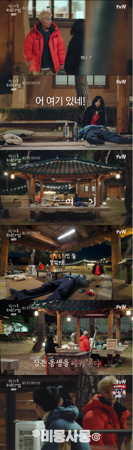 강남의 부름에 겨우 잠에서 깬 최현욱은 비몽사몽한 얼굴로 “저기 따뜻해요”라는 정자 위가 따뜻하다고 말해 눈길을 끌었다.