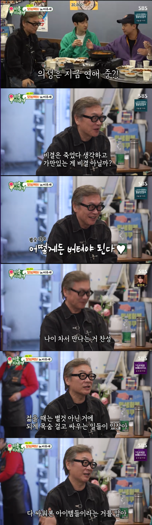 김의성이 꼽은 중년 연애의 가장 큰 장점은 바로 싸움의 기술이었다. 김의성은 “나이 들어 만나면 별거 아닌 걸로는 이미 다 싸워본 아이템이라는 걸 서로 안다”며, 젊은 시절 겪었던 소모적인 감정 싸움이 줄어든다는 점을 강조해 출연진들의 깊은 공감을 샀다.