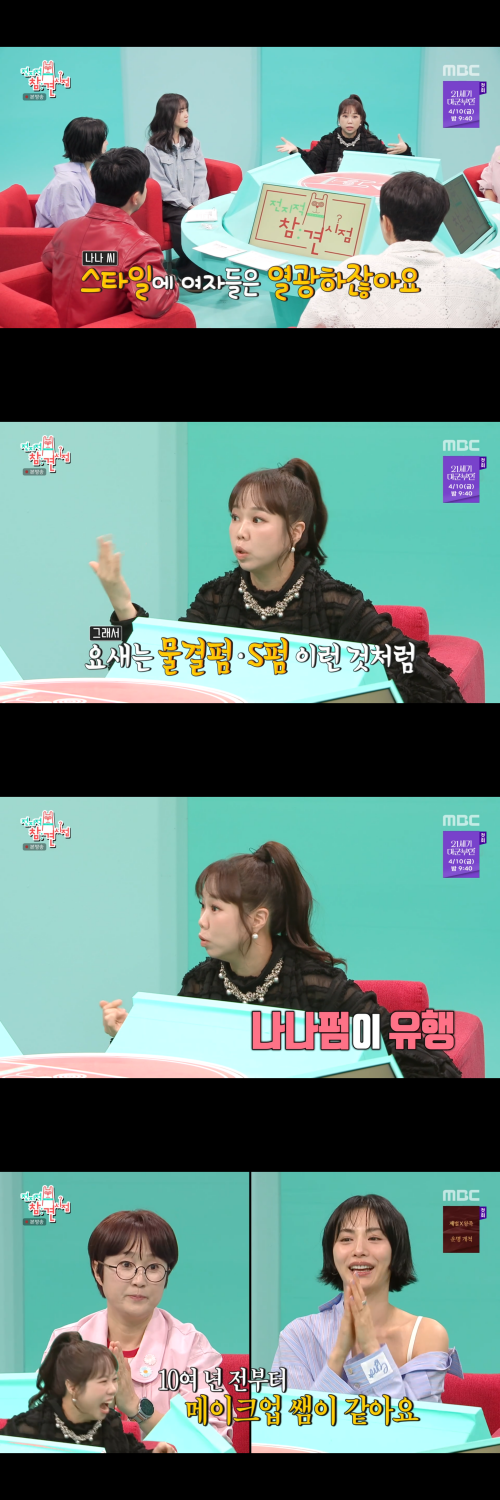 홍현희는 “나나 스타일에 여성들이 열광한다”며 “미용실에 가면 ‘나나펌’이 있는 거 알고 있냐”고 물었고, 나나는 쑥스러운 듯 “알고 있다”고 답했다.