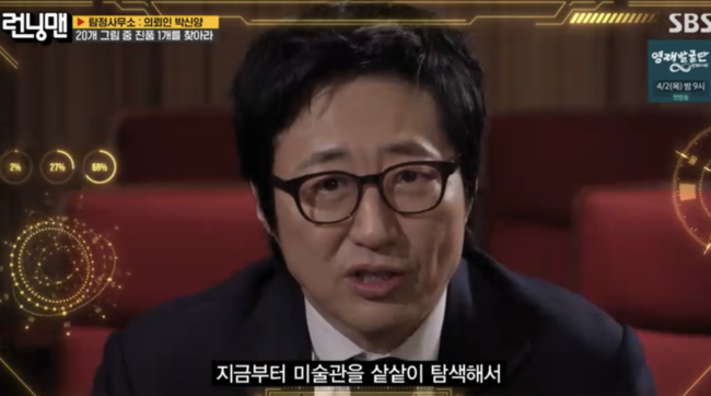 21일 방송된 런닝맨에서는 탐정으로 변신한 멤버들 앞에 박신양이 의뢰인으로 등장, 자신이 직접 준비한 미술 전시를 배경으로 한 추리 미션을 제시했다.