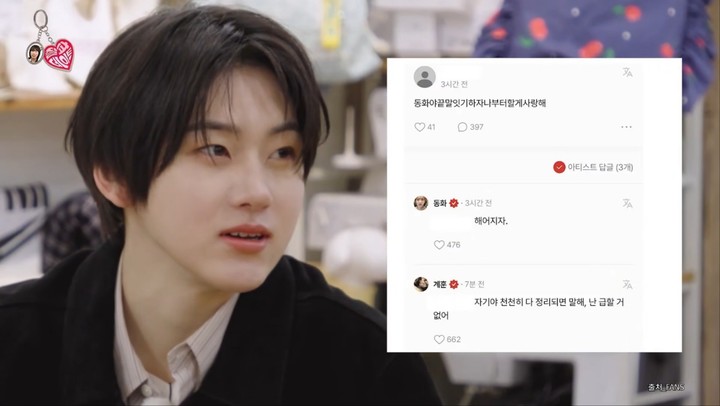 반면 계훈은 동화의 행동을 "투머치"라고 선을 그으면서, 팬 소통 플랫폼에 뜸했던 것에 대해 "권태기였다. 권태기를 지나 관계가 더 편해지고 돈독해졌다"고 너스레를 떨었다.