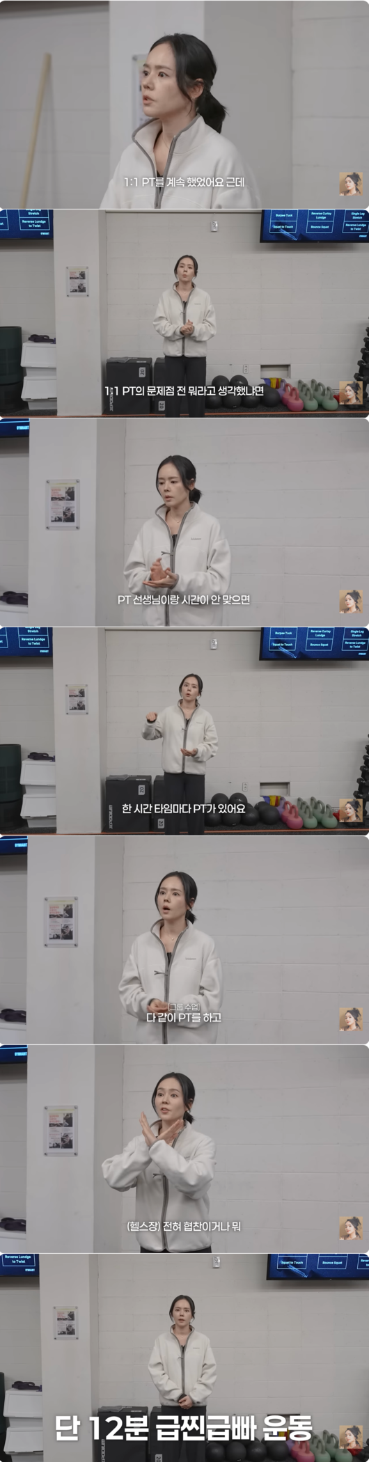이어 현재 이용 중인 운동 방식에 대해 “여기는 한 시간 타임마다 PT가 있어요. 그래서 내가 예약도 없이 다 같이 PT를 하고. 전혀 협찬이거나 뭐 그런 게 아니다”라고 강조하며, 시간에 구애받지 않는 자율적인 운동의 장점을 설명했다. 또한 “오늘은 리얼타임으로 따라 하시면 좋을 것 같다”라고 덧붙였다.