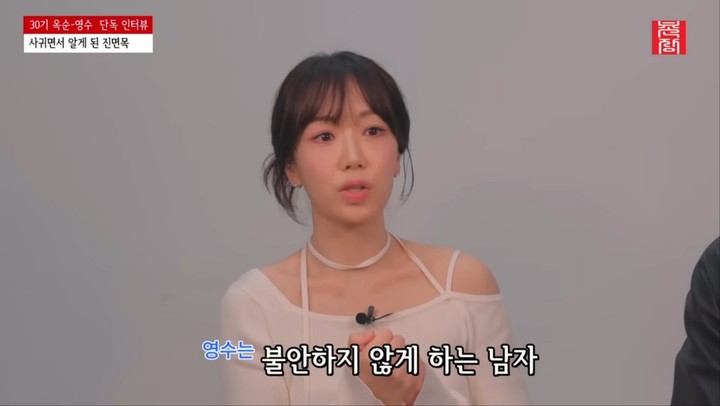 옥순 역시 영수를 향한 애정을 드러냈다. 그는 "방송에서는 과묵하고 차가운 이미지였는데, 밖에서는 연락도 적극적으로 하고 표현도 많이 해준다"고 말했다. 이어 "뭘 하고 있는지 투명하게 보여줘서 불안감을 주지 않는다. 바른 사람이라는 확신이 들었다"고 덧붙였다.
