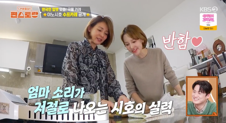 야노 시호는 육아로 끼니를 거른 아유미를 위해 직접 요리 솜씨를 발휘했다. 그녀가 선택한 메뉴는 홋카이도 삿포로의 명물 '스프 카레'였다. 야노 시호는 화려한 칼질로 이연복 셰프의 감탄을 자아냈고, 현장에서 지켜본 아유미 역시 "엄마는 엄마다"라며 연신 감탄했다. 건강을 위해 생강과 마늘을 듬뿍 넣은 이 카레에 대해 그녀는 "사실 일본에선 마늘을 이렇게 안 넣는데, 추상의 한국 스타일"이라고 설명했다. 또한 "남편이 집에 없어서 추성훈에게는 준 적이 없다"라는 '웃픈' 비화를 밝히기도 했다.