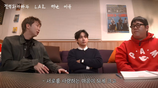 이날 '빠더너스' 문상훈은 컴백을 앞둔 시점의 BTS RM, 뷔와 함께 다양한 이야기를 나눴다. 이런 가운데 멤버들이 모두 전역한 후 LA에서 송캠프를 하게 된 과정을 묻자 RM은 "저희가 전역을 했지 않나. 어찌저찌해서 2년 반정도가 걸려서 전역을 했고 진이랑 제이홉이라는 멤버가 먼저 활동을 저희 대신 열심히 해주고 있었고 저희 브랜드를 잘 유지시켜주기 위해서 너무 고생을 많이 했다"고 운을 뗐다.