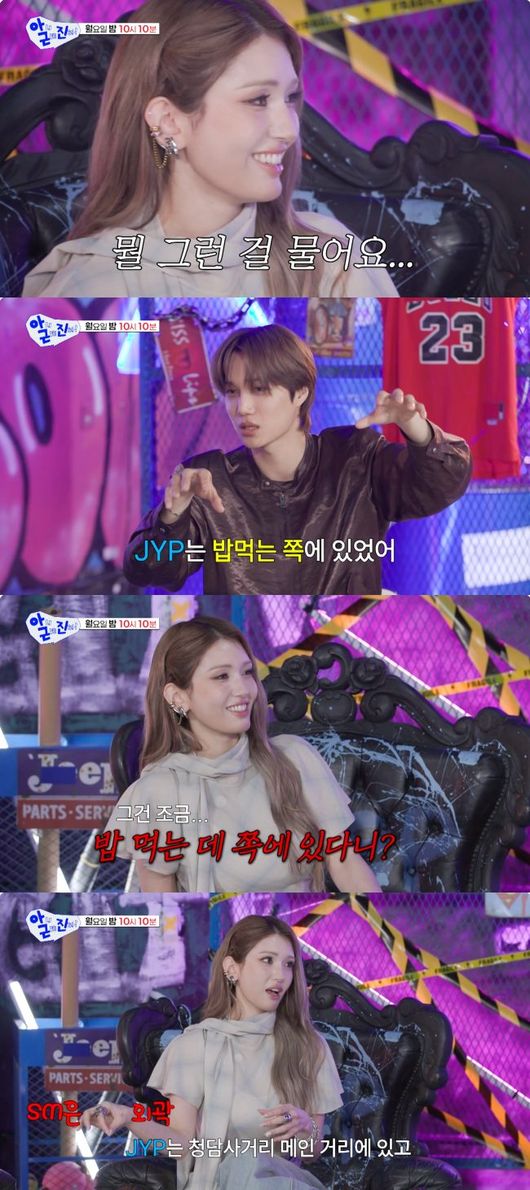 이에 전소미는 “그건 조금.. 밥 먹는 데 쪽에 있다니?”라며, “우리는 오히려 반대로 이야기한다. 우리는 청담사거리 메인에 있고, SM은 살짝 비껴있다”라고 지적했다.
