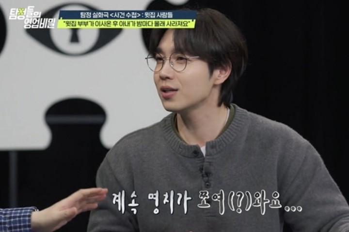 가스 검침원으로 위장해 윗집에 잠입한 탐정단은 세 사람의 대화를 듣게 됐다. 의뢰인의 아내는 "언제까지 남편에게 숨길 수 있을지 모르겠다"며 불안한 속내를 말했고 윗집 아내는 "이렇게 된 거 남편한테 솔직하게 얘기하고 같이 하자. 의외로 좋아할 수도 있다"고 설득했다. 윗집 남편 역시 "다 같이 하면 더 좋지 않겠냐"고 거들었다. 이를 보던 데프콘은 "윗집 부부가 의로인의 아내를 초대해 셋이서 부적절한 관계를 맺는 게 아닐까"라고 추측하며 현장을 충격에 빠뜨렸다.