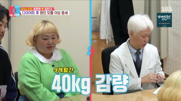 이에 전문의는 “그동안 지방이 몸에서 단열재 역할을 해왔는데, 그 단열재가 빠져나가면서 몸이 적응하는 단계”라고 설명하며 “비정상에서 정상화되는 과정”이라고 분석했다. 이를 지켜보던 MC 김구라는 “그동안 단열재가 너무 두꺼웠던 것”이라며 특유의 화법으로 홍윤화를 위로했다.
