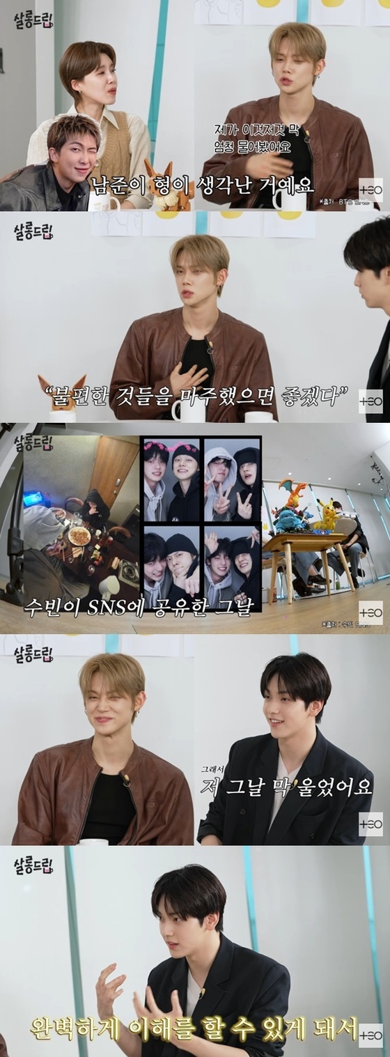 이에 연준은 방탄소년단(BTS)의 RM을 찾아갔고, "불편한 것들을 마주해봤으면 좋겠다"라는 조언을 들었다고. 이후 연준은 "수빈이랑도 다투고 어색한 기간이 있었는데, 다 없애버리고 싶었다, 내가 잘못 생각한 것도 많았다"라며 수빈에게 먼저 술자리를 제안해 화해의 자리를 마련했다고 밝혔다.