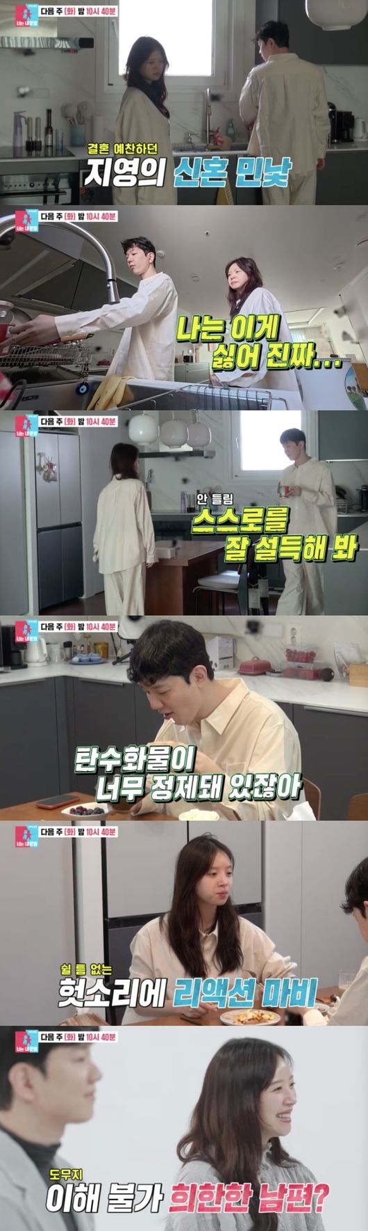 그러나 곧 반전 일상이 공개되었다. 이른 아침 두 사람은 서로 다른 취향으로 인해 삐거덕거렸다. 쉴 틈 없는 남편의 잔소리에 김지영의 표정이 굳어가기도. 남편 또한 “여러 가지로 해롭다”라고 말해 궁금증을 자아냈다.