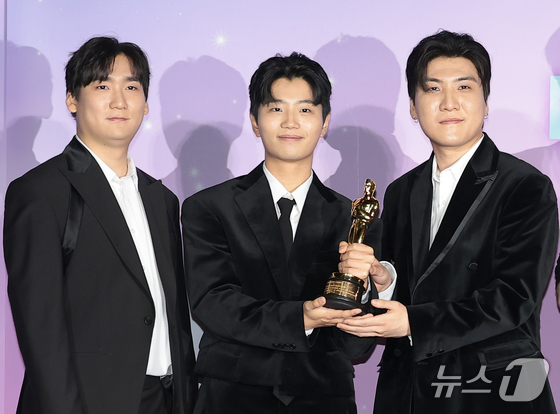 프로듀서 IDO(아이디오) 남희동(왼쪽부터)과 이유한, 곽중규가 1일 서울 용산구 CGV 용산아이파크몰에서 열린 넷플릭스 영화 ‘케이팝 데몬 헌터스’(이하 케데헌) 아카데미 수상 기념 기자간담회에 참석해 포즈를 취하고 있다. 2026.4.1 © 뉴스1 권현진 기자