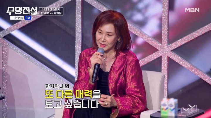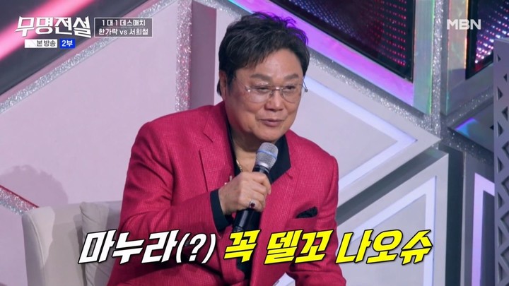 한가락은 본선 2차 선곡 미팅에서도 갑자기 눈물을 흘렸다. 무명전설에서 우승하면 상금 1억 원과 신곡 음원 발매, 전국 투어 콘서트, 크루즈 팬미팅, 제주도 세컨드 하우스, 우승자 이름을 건 프로그램 제작 등 다양한 혜택이 있지만, 아내는 고작 1년에서 2년 정도 활동하다 다시 막일을 할 것이라고 예상하며 만류했다.