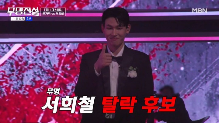 1일 방송된 MBN 예능 '무명전설' 6회에서는 본선 2차전 1대1 데스매치가 그려졌다. 38명이 오른 본선 2차는 1대1로 겨루며, 승자 19명은 본선 3차로 올라갈 수 있고 패자는 탈락 후보가 된다.