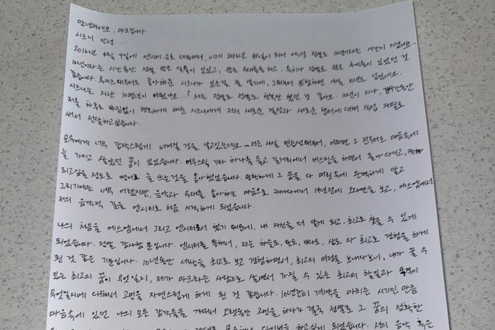 (MHN 윤우규 기자) 그룹 NCT 마크가 SM 엔터테인먼트(이하 SM)를 떠나는 심경을 자필 편지로 직접 전했다.