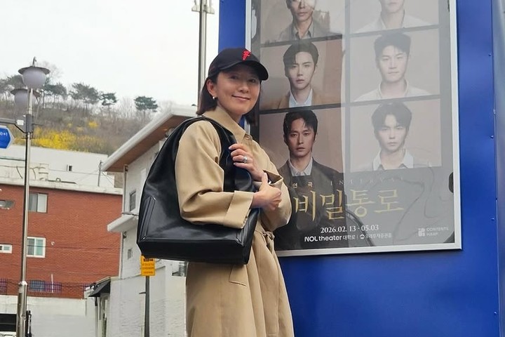 공개된 사진 속에는 김희애가 볼캡을 눌러쓴 채 연극 '비밀통로' 포스터 앞에서 포즈를 취하고 있다. 밝은 미소로 카메라를 응시한 그는 "연극", "비밀통로"라는 해시태그를 덧붙이며 김선호가 출연하는 해당 작품을 공개적으로 응원했다.