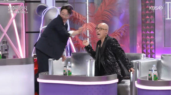 이에 공감한 김준현은 조용히 일어나 이휘재와 자리를 바꿨다. 이휘재는 어리둥절한 표정으로 MC석에 앉았고 "박수 세 번 시작"이라며 현장을 침착하게 정리했다.