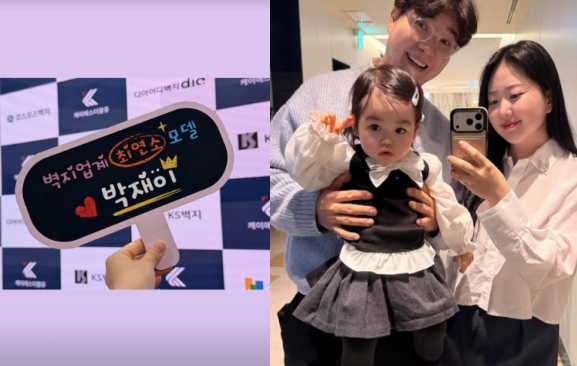 딸의 눈부신 활약에 함박웃음을 짓는 부부도 있다. 박수홍의 아내 김다예는 6일 SNS에 "벽지업계 최연소 모델 박재이"라는 문구가 적힌 팻말을 들고 기뻐하는 인증 사진을 게재했다.