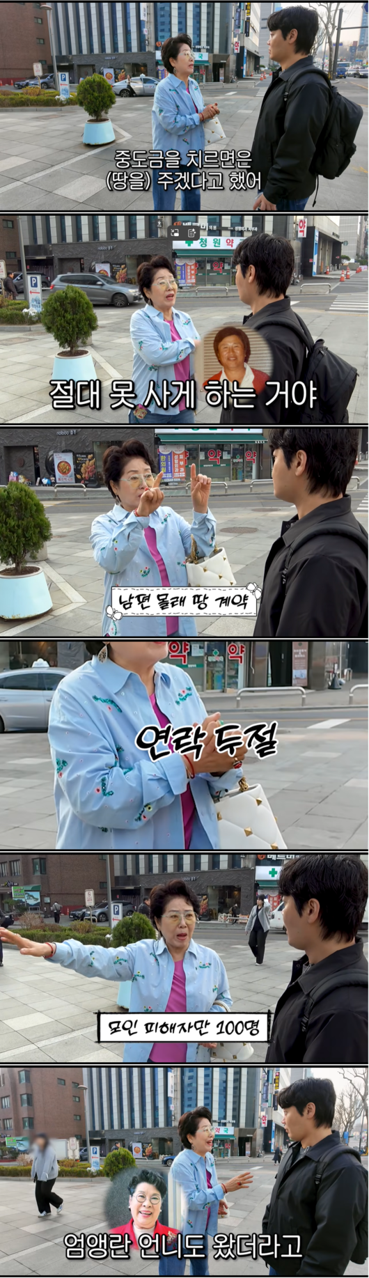 결국 남편이 계약서를 확인한 뒤에야 사기임을 깨달았다는 선우용여는 "그래서 우리 남편이랑 나랑 (사기꾼을) 잡으러 갔어"라고 전했다. 현장에는 이미 사기를 당한 피해자들만 100여 명이 모여 있는 아수라장이었다.