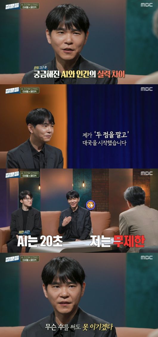 이날 손석희는 “은퇴한 이후에 혹시 AI와 재대결해 본 적 있냐. 개인적으로라도”라고 물었다. 이세돌은 “해본 적 있다. 제가 19년 말에 은퇴했다. 21년도에 궁금했다. 도대체 얼마나 차이가 나는가라며 “제가 두 점을 깔고 시작했다”라고 밝혔다.