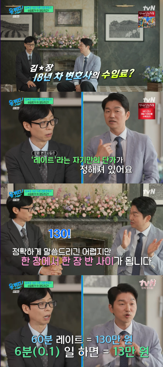 무엇보다 이날 시청자들의 관심을 집중시킨 것은 대형 로펌 18년 차 변호사의 몸값이었다. 박민철은 “로펌 변호사들은 ‘레이트’라고 불리는 자기만의 시간당 단가가 책정되어 있다”고 설명했다.