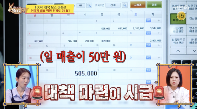이에 신기루가 의아해하자, 이순실은 "가게 오픈한 지 7개월이다. 오픈할 때는 1억 가까이 매출이 있었다. 꽉꽉 사람들 밖에 줄 섰는데, 겨울이 되니까 확 꼬부라지고, 매출 80%가 줄었다. 어떻게 할 수가 없어서 녹두전에 코다리찜에 등 메뉴를 넣었다"라며 현재 식당에서의 메뉴가 약 20가지라고 털어놨다.