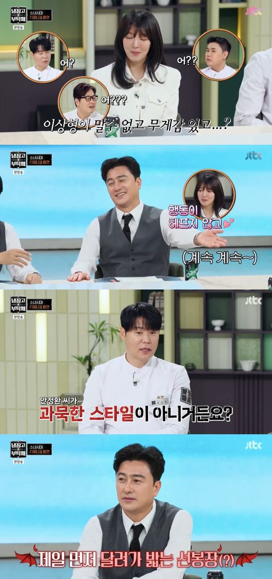 평소 ‘냉부해’ 팬이라는 효연에 안정환은 “이 사람 때문에 출연까지 결심했다고 하더라”라고 물었다. 셰프들이 기대하는 가운데 효연은 이상형으로 MC 안정환을 꼽아 모두를 놀라게 했다. 이유를 묻자 그는 “왜냐면 이상형이 말수 없고, 무게감이 있고 행동이 헤프지 않는다”라고 밝혔다.