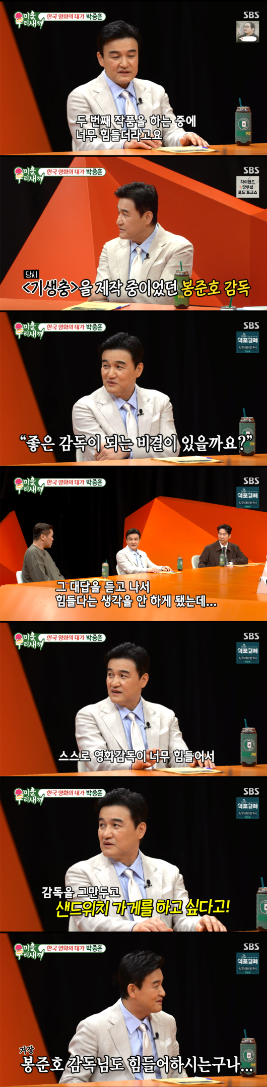 거장 봉준호에게서 돌아온 대답은 의외였다. 박중훈은 “그 대답을 듣고 힘들다는 생각이 안 들었다. 설국열차 만들때 너무 힘들어서 그만두고 샌드위치 가게를 하고 싶다고. 내가 힘들다는 얘기를 하면 안되겠다는 격려가 됐다”라며 봉 감독 또한 치열한 번아웃을 겪었음을 언급했다.