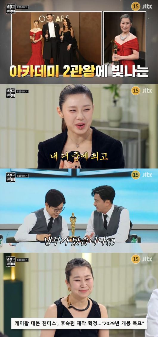 무엇보다 메기 강은 오스카 트로피 실물을 공개해 이목을 끌었다. 안정환은 “‘냉부’가 탔다”라고 했고, 김성주는 “‘케데헌’ 속편 제작이 확정됐다”라며 근황을 전했다.
