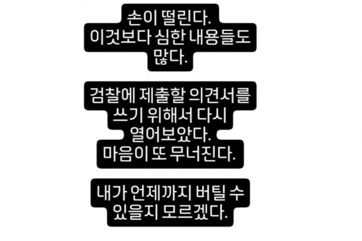 이를 두고 서유리는 "손이 떨린다. 이것보다 심한 내용들도 있다. 검찰에 제출할 의견서를 쓰기 위해서 다시 열어봤다. 마음이 또 무너진다"고 호소했다. 또 그는 "내가 언제까지 버틸 수 있을지 모르겠다"고 복잡한 심경을 전했다.