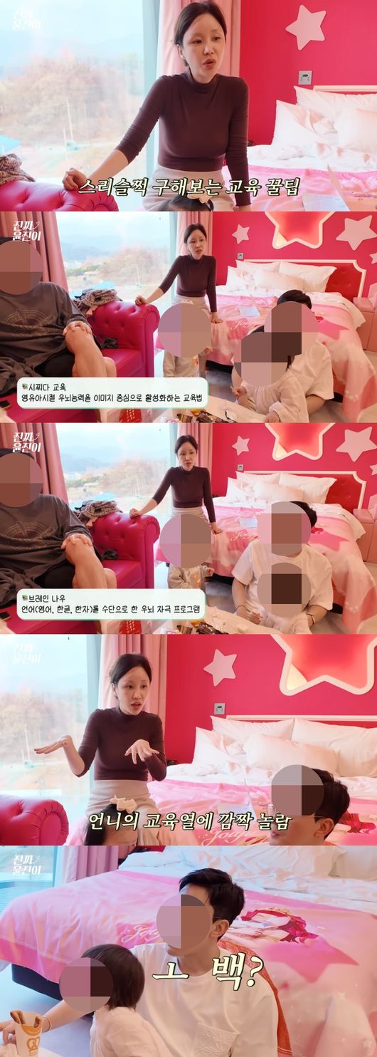 이 가운데 양평의 한 호텔에서 만난 지인 가족들은 자녀 사교육에 대해 이야기했다. 윤진이는 자연스럽게 "언니 좋은 것 좀 알려달라"라며 자녀 교육 노하우에 대해 물었다.
