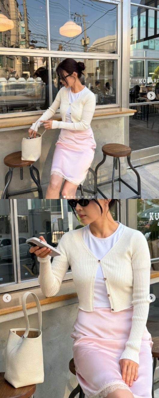 사진 속 한지혜는 무릎 기장의 핑크색 스커트에 흰색 반팔, 아이보리 컬러의 얇은 카디건을 매치해 캐주얼하면서 청순한 룩을 완성했다. 머리 말아 올린 그는 선글라스를 착용하며 야외 테이블에 앉아 포즈를 취하고 있다.