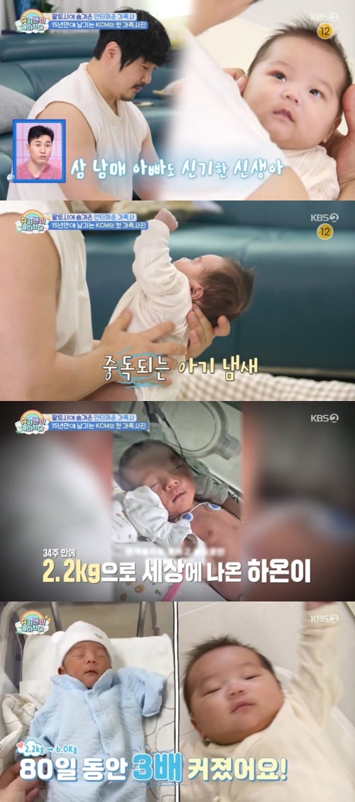 이날 KCM은 셋째 아들 하온이를 향해 "보고만 있어도 배부르다. 한번 눈에 넣어볼까? 안 들어가네?"라고 말했다. 아기 냄새를 맡으며 연신 행복해하기도. 영상을 지켜보던 MC 김종민이 "얼굴이 이미 완성형"이라며 놀라워했다.