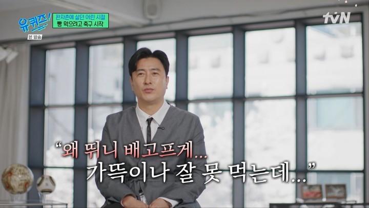 그의 축구 시작도 가난함에서 시작됐다. '배고픔'을 달래기 위해 축구를 시작했던 것. 판자촌에서 자라며 먹을 것이 부족했던 어린 시절, 안정환은 "축구부 연습이 끝나면 빵과 우유를 줘서 축구를 시작했다"고 털어놨다.