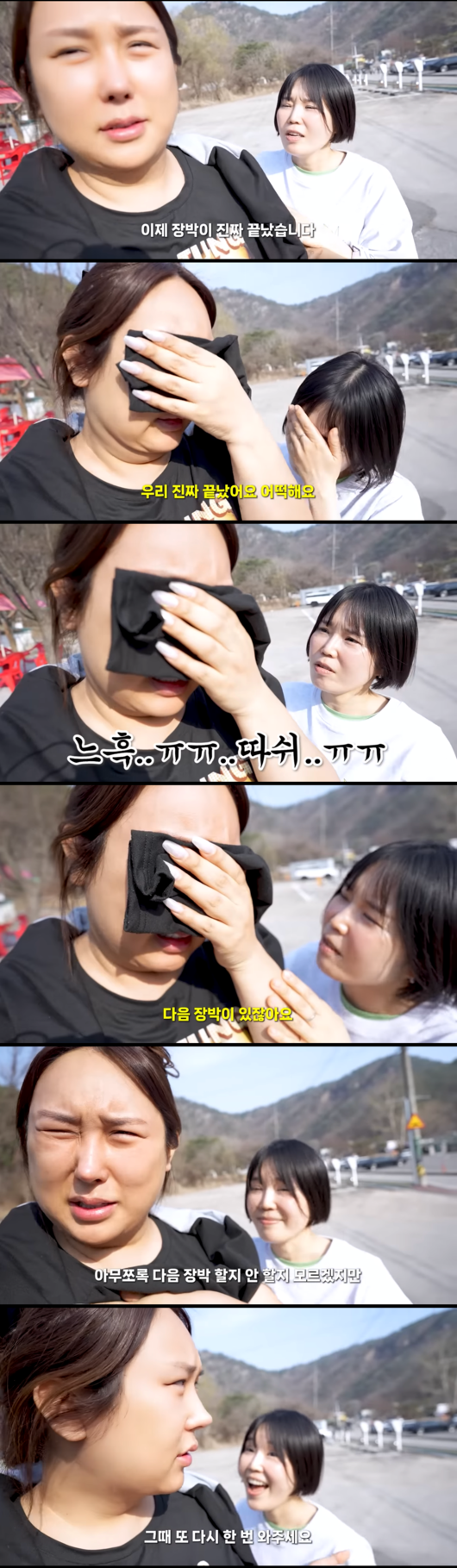 식사를 마무리하고 나온 풍자는 “이제 집에 가야 돼요. 이제 장박이 진짜 끝났습니다. 눈물이 납니다”라고 말하며 두 손으로 얼굴을 가린 채 오열하는 척 열연을 펼쳤다.