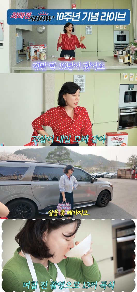 앞서 홈쇼핑 10주년 기념 행사를 앞두고 최화정은 10년 전에 입었던 옷을 입겠다고 포부를 밝힌 바 있다. 그는 “역사적인 날이다. 10년까지 할 거라고 생각 못했다”라고 말했다.