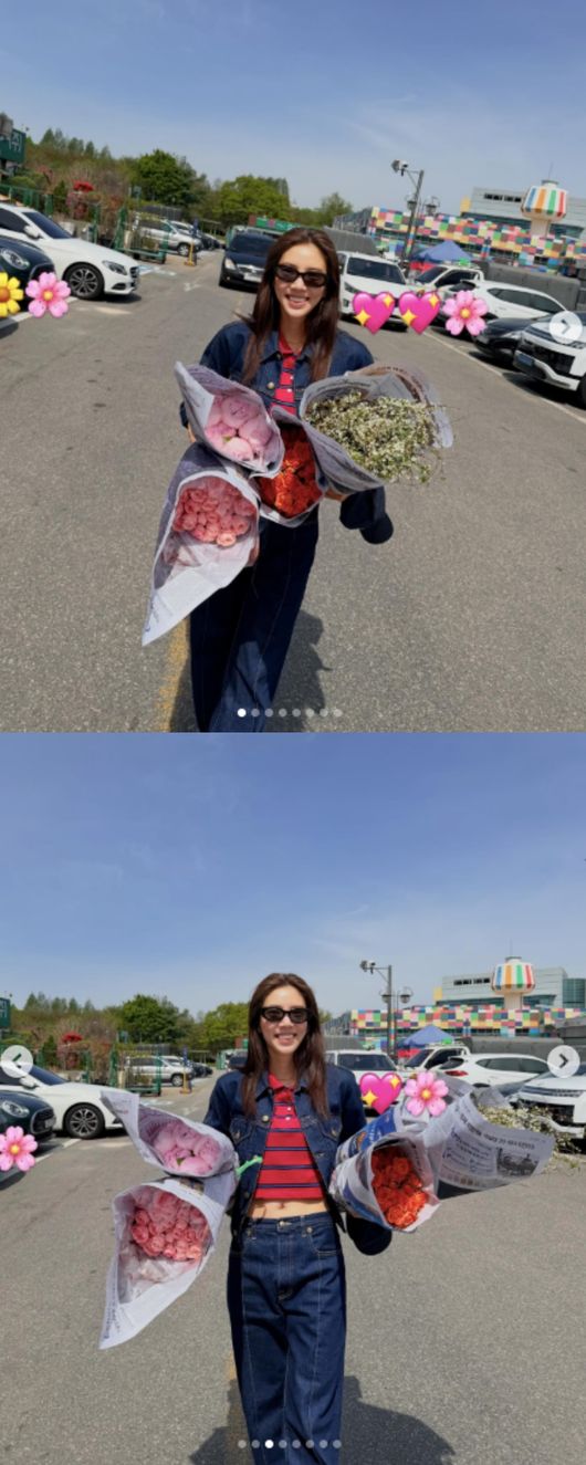 사진 속 손담비는 청청패션에 빨간색 반팔티를 포인트 매치해 포즈를 취하고 있다. 선글라스를 착용해 양손 가득 꽃다발을 들고 있는 그는 야외 주차장에서 환한 미소를 띄고 있는 모습이 담겼다.