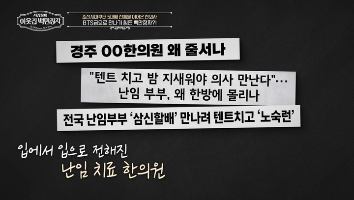 이 한의원이 '난임 명가'로 이름을 떨치게 된 배경도 공개됐다. 초대 원장이었던 고조부 역시 난임으로 고통받았고, 끊임없는 연구 끝에 자녀를 갖게 되면서 환자들이 마을 입구까지 줄을 설 정도로 문전성시를 이뤘다.