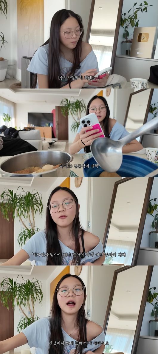 그런 사랑에게 제작진이 "가장 좋아하는 과목은 뭐냐"라고 묻자, 사랑은 인문학을 꼽았다. 특히 추사랑은 "과제로 일본 이민 문제에 대해 이야기했다. 일본에 외국인을 받아야 하는지, 말아야 하는지에 대해 찬성과 반대 중 하나를 선택하고 그에 따른 근거 1, 2, 3을 써야 했다"라고 밝혀 놀라움을 더했다.