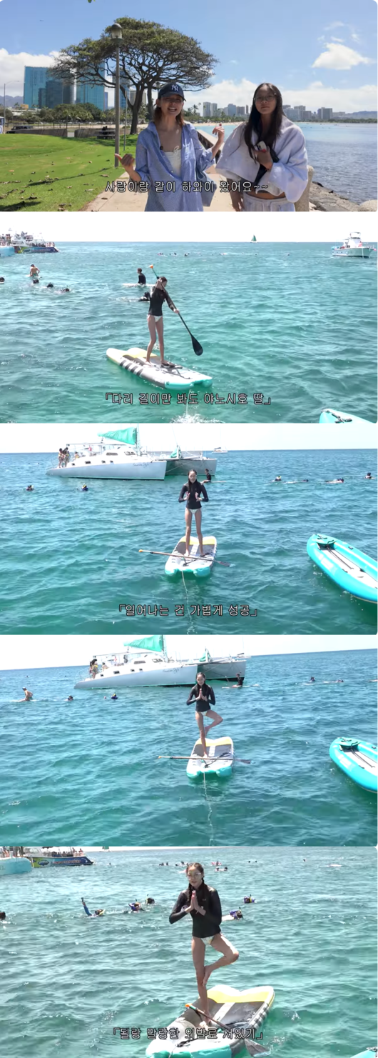 야노시호는 카메라를 향해 “사랑이랑 같이 하와이 왔어요”라고 인사를 건네며 여행의 시작을 알렸다. 이어 사랑이에게 “오랜만이에요 어때요?”라고 소감을 묻자, 사랑이는 “응 재밌어요”라고 답했다.