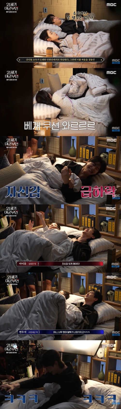 둘은 다시 이불 쟁탈전을 이어갔고, 이번에는 변우석이 "가만있거라!"라고 소리쳤다. 아이유는 또 웃참에 실패했고, 감독은 "내가 '가만있거라'는 나중에 꼭 쓸게"라고 약속하기도 했다.