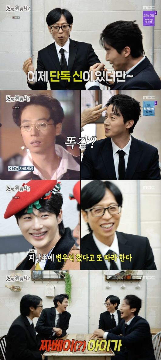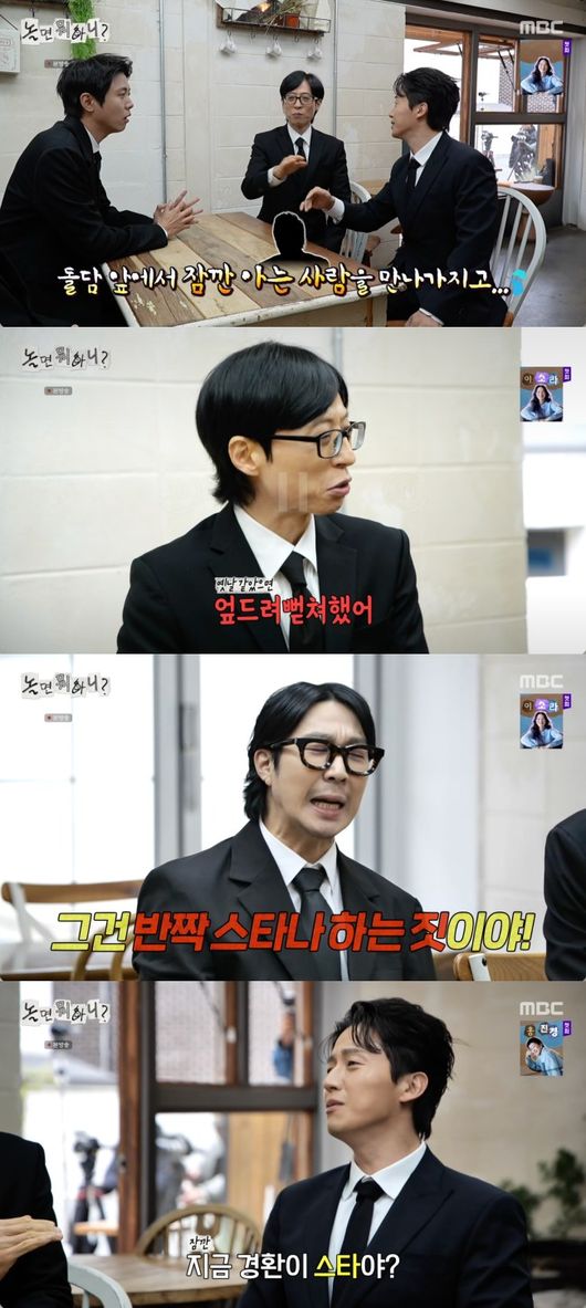 이날 오프닝에서 양복을 차려입고 만난 유재석은 허경환에데 “경환아 지각하면 안 된다”라고 여러 차례 강조했다. 이에 허경환은 “오다가 돌담 앞에서 아는 사람을 만났다”라면서 급하게 수습에 나섰다.